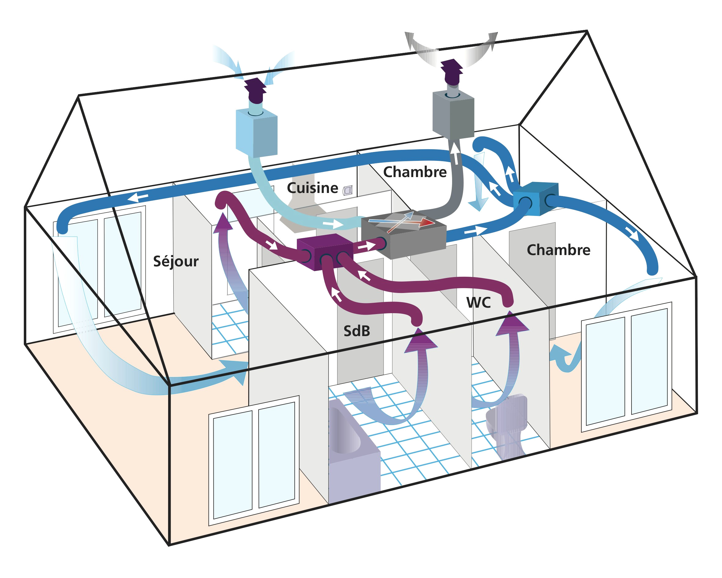 Une VMC double flux hygroréglable fonctionne selon les principes suivants :